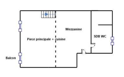 Pièce de vie avec coin cuisine équipée, 1 mezzanine coin nuit, SDE avec wc, balcon